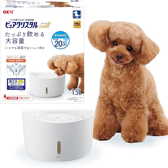 ピュアクリスタルは、フィルター式の犬用給水器みたいだね。常に水が循環するから、新鮮な状態をキープできるのが特徴みたい。フィルターで不純物を取り除くから、より美味しい水を愛犬に飲ませてあげられるみたいだよ。